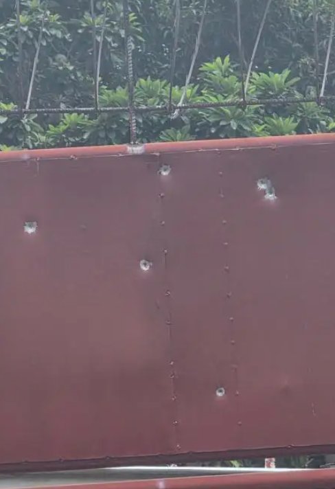 Afortunadamente, los seis disparos no impactaron a ningún agente policial ni a las personas que se encontraban en el lugar; en cambio, terminaron incrustados en el portón rojo de una casa vecina.
