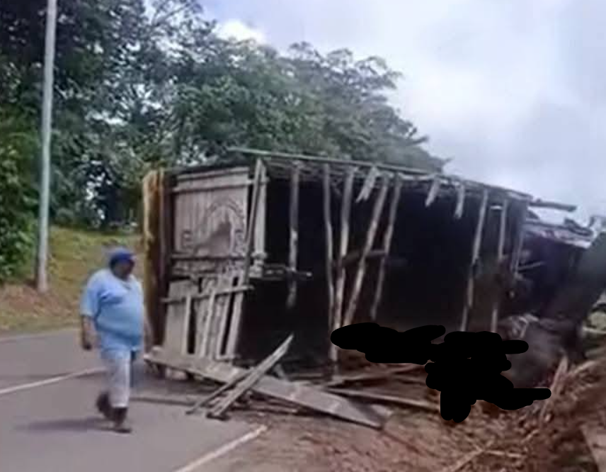 El vuelco de un camión ganadero ha dejado dos personas golpeadas, varios semovientes muertos y bastantes daños materiales, en el sector que se conoce como la vuelta o bajada de fruta de pan, sobre la carretera hacia Wapi, Caribe Sur de Nicaragua.