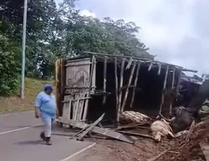 El vuelco de un camión ganadero ha dejado dos personas golpeadas, varios semovientes muertos y bastantes daños materiales, en el sector que se conoce como la vuelta o bajada de fruta de pan, sobre la carretera hacia Wapi, Caribe Sur de Nicaragua.