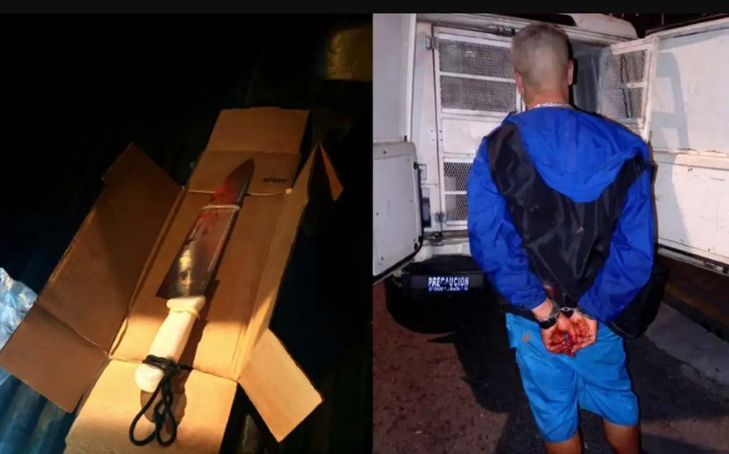 El nica detenido y el cuchillo con que asesinó a su esposa.