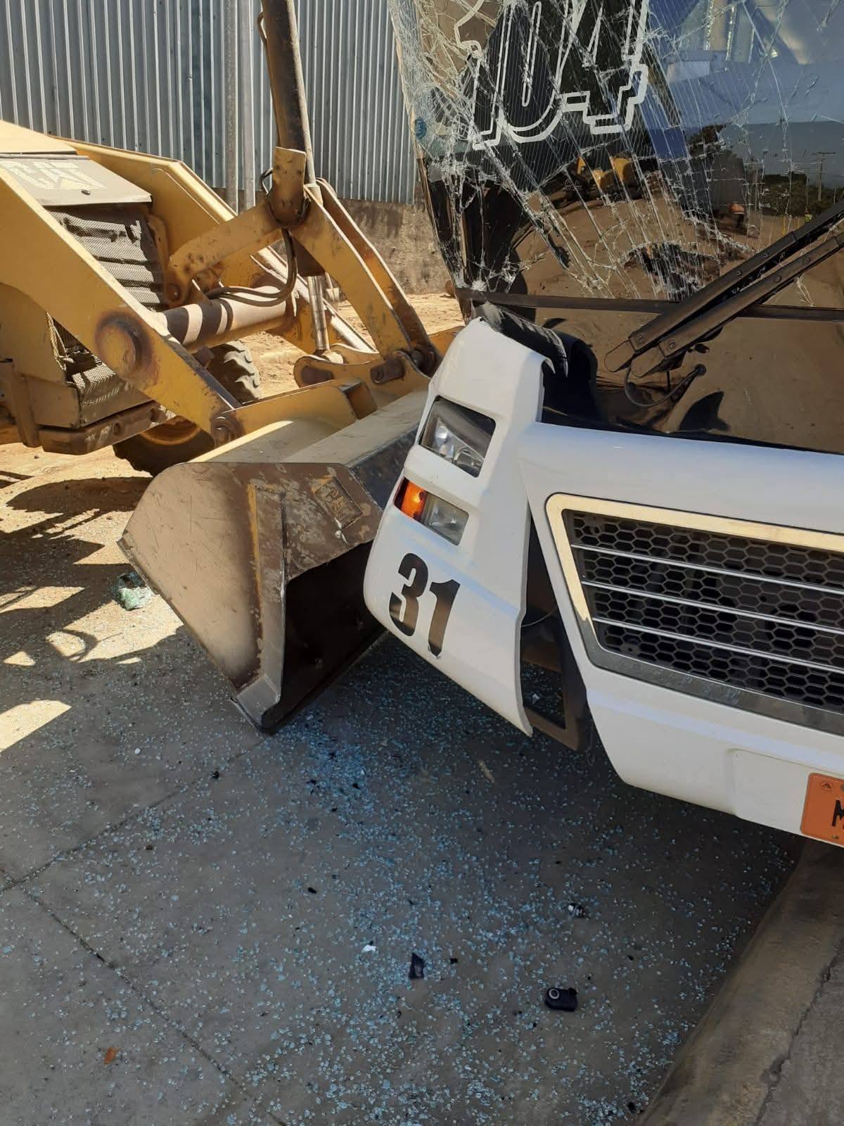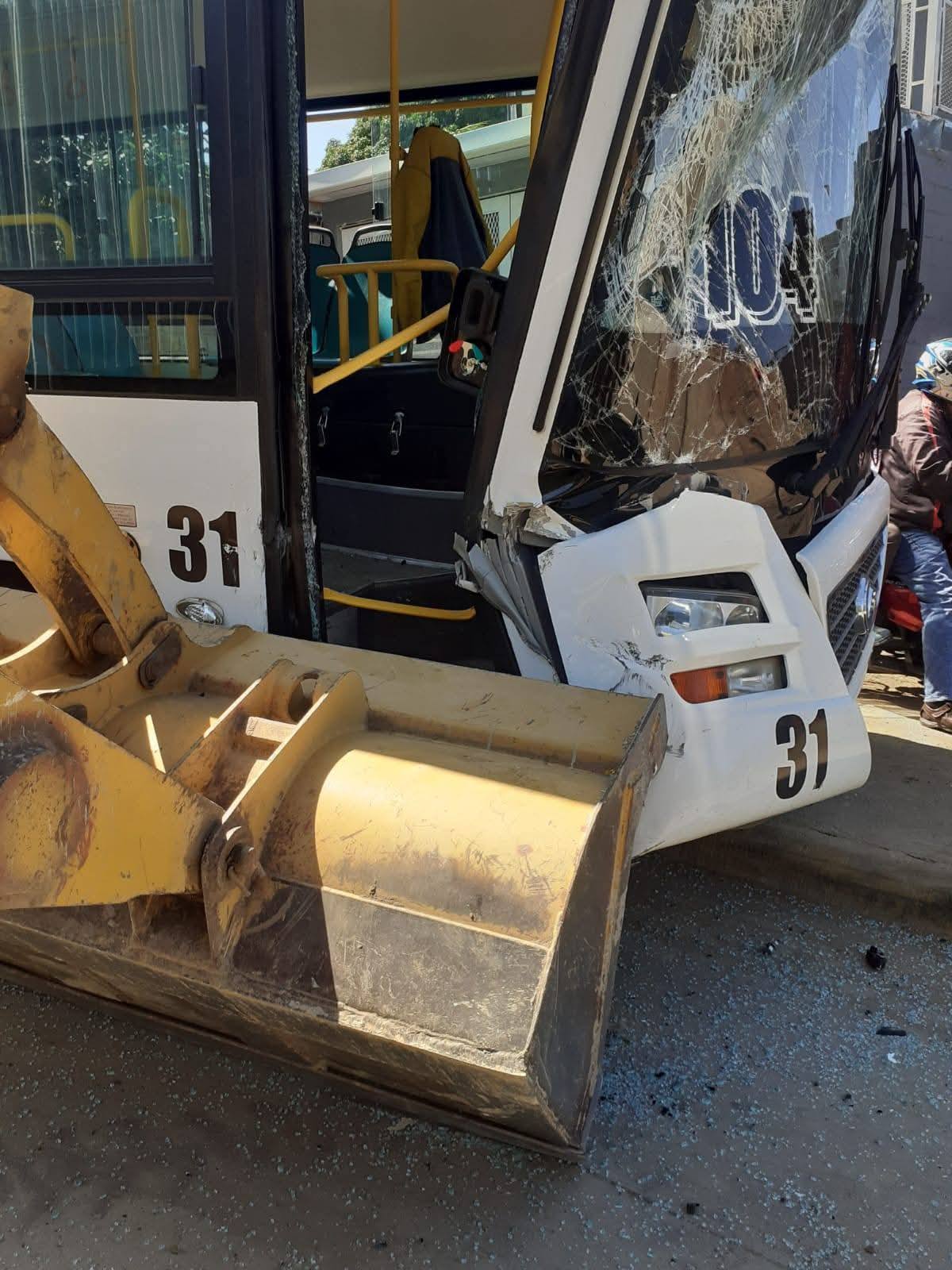 Con daños severos termina un autobús de transporte público de Managua después que el conductor impactara contra una maquinaria pesada. En las imágenes se aprecia la parte frontal derecha de la ruta 104 destrozada.