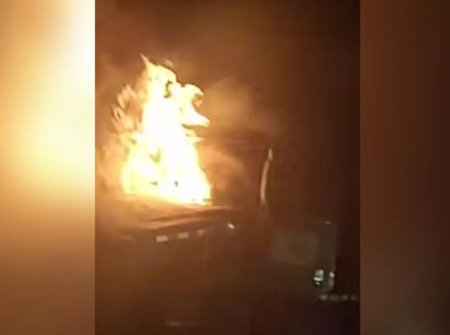 En horas de la noche un furgón que tiraba de dos rastras cargadas de caña de azúcar se incendia por razones desconocidas terminando completamente destruido.