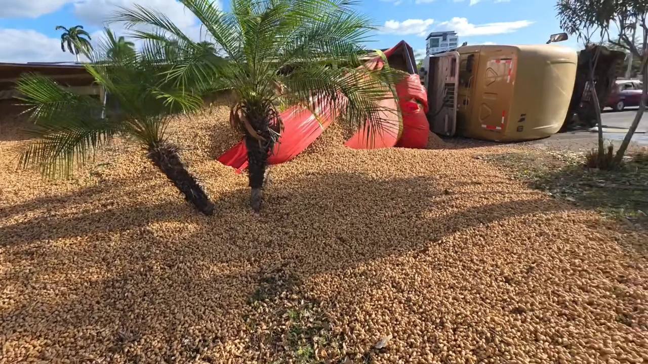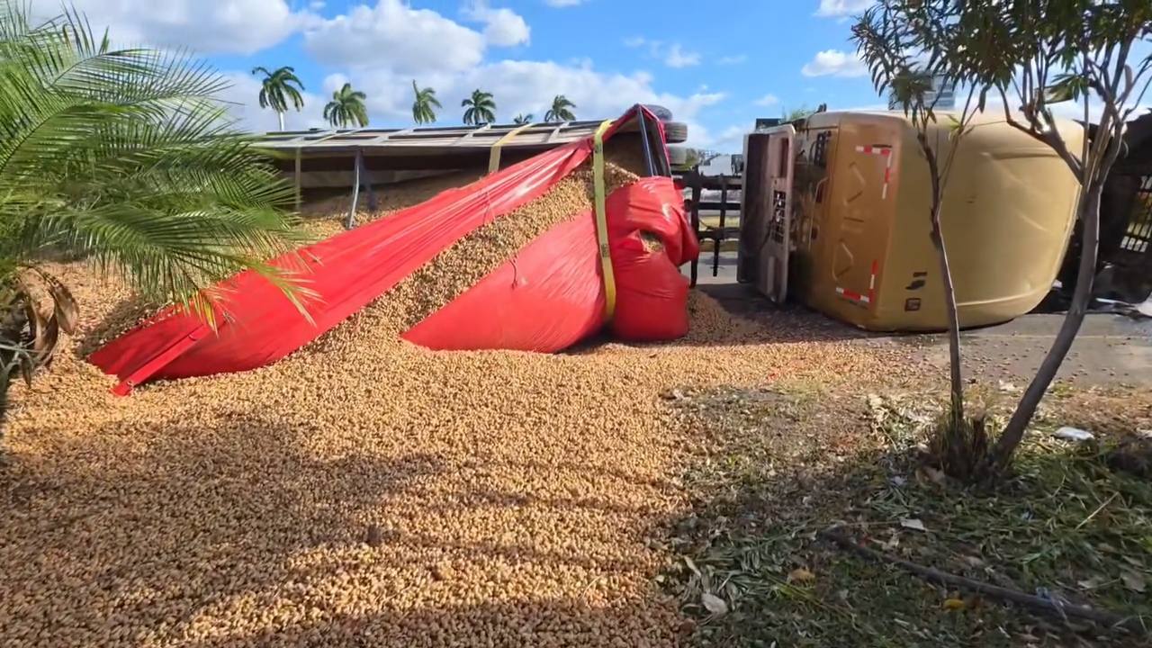 El vehículo transportaba aproximadamente 550 quintales de maní, los cuales terminaron esparcidos en la vía, generando únicamente pérdidas materiales.