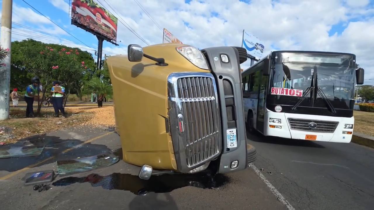 El camión con placa CH 47214 se volcó en horas de esta tarde en la rotonda de Metrocentro, en la ciudad de Managua, cuando se dirigía desde Granada rumbo a Corinto, en el departamento de Chinandega, informan fuentes locales.
