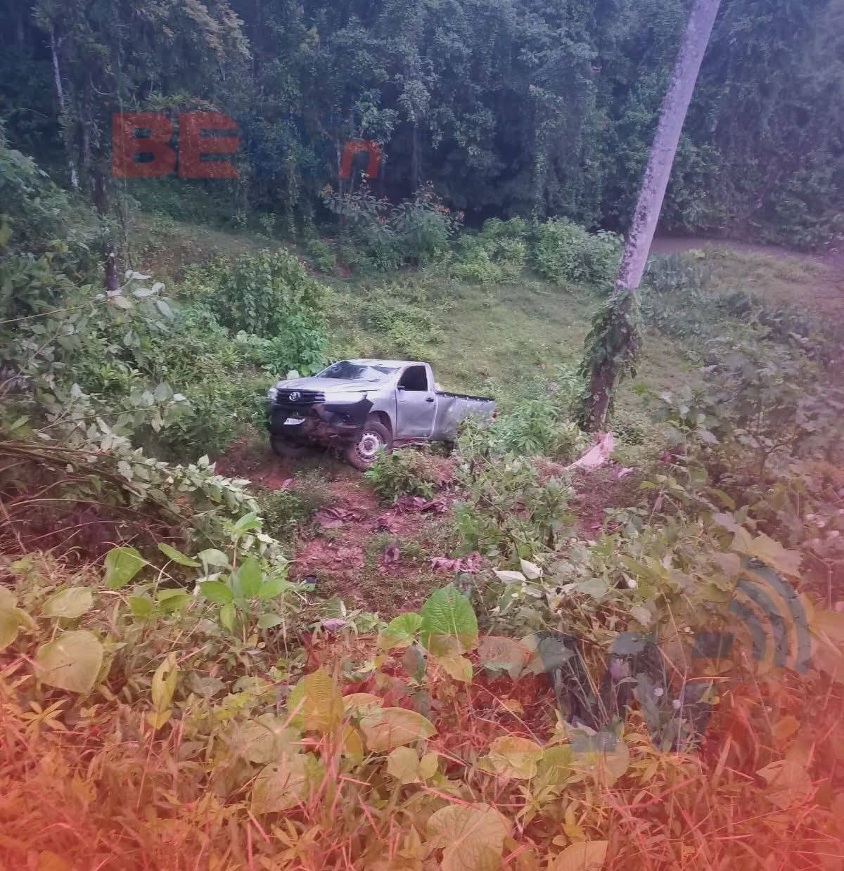 El chófer de una camioneta color gris, doble cabina, sufre un accidente y se precipitó a un guindo en horas de la madrugada de ayer viernes, exactamente en el puente El Espanto, a escasos kilómetros de la Colonia Naciones Unidas de Nueva Guinea, Caribe Sur.