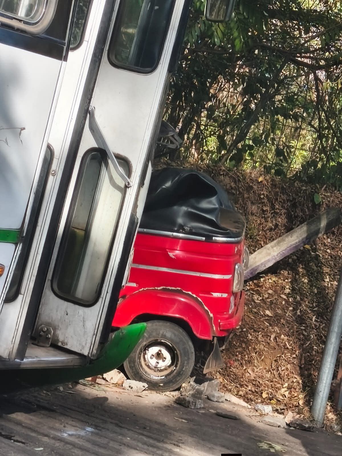 La moto-taxi fue colisionada por el autobús marca mercedes Benz, color blanco con negro, matrícula M 368-210, manejado por Jackson Alexander Hernández, de 22 años, quien invadió el carril contrario por donde circulaba la moto taxi en su preferencia.