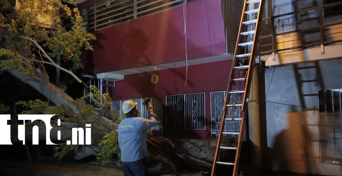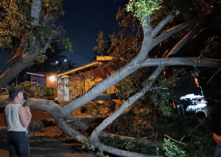 La emergencia fue atendida por trabajadores de la Alcaldía de Managua, quienes con sierras eléctricas y una pala mecánica retiraron las ramas del árbol que quedaron sobre la vía, interrumpiendo el paso vehicular y peatonal en la zona.