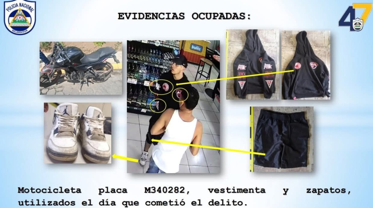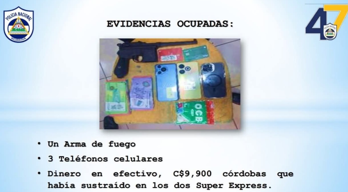 Al momento de su captura, las autoridades le ocuparon un arma de fuego, tres teléfonos celulares y 9,900 córdobas en efectivo, dinero que presuntamente había sustraído de ambos negocios.Montano Páramo ya había sido señalado por asaltos ocurridos el pasado 16 de abril en el Distrito 5 de Managua. Tras las denuncias, la Policía activó un operativo que permitió su ubicación y detención.