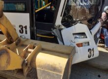 Con daños severos termina un autobús de transporte público de Managua después que el conductor impactara contra una maquinaria pesada. En las imágenes se aprecia la parte frontal