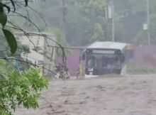 Una ruta del transporte colectivo quedó varada en la pista Sabana Grande de la capital Managua, debido a las fuertes corrientes provocadas por la lluvia caída esta tarde